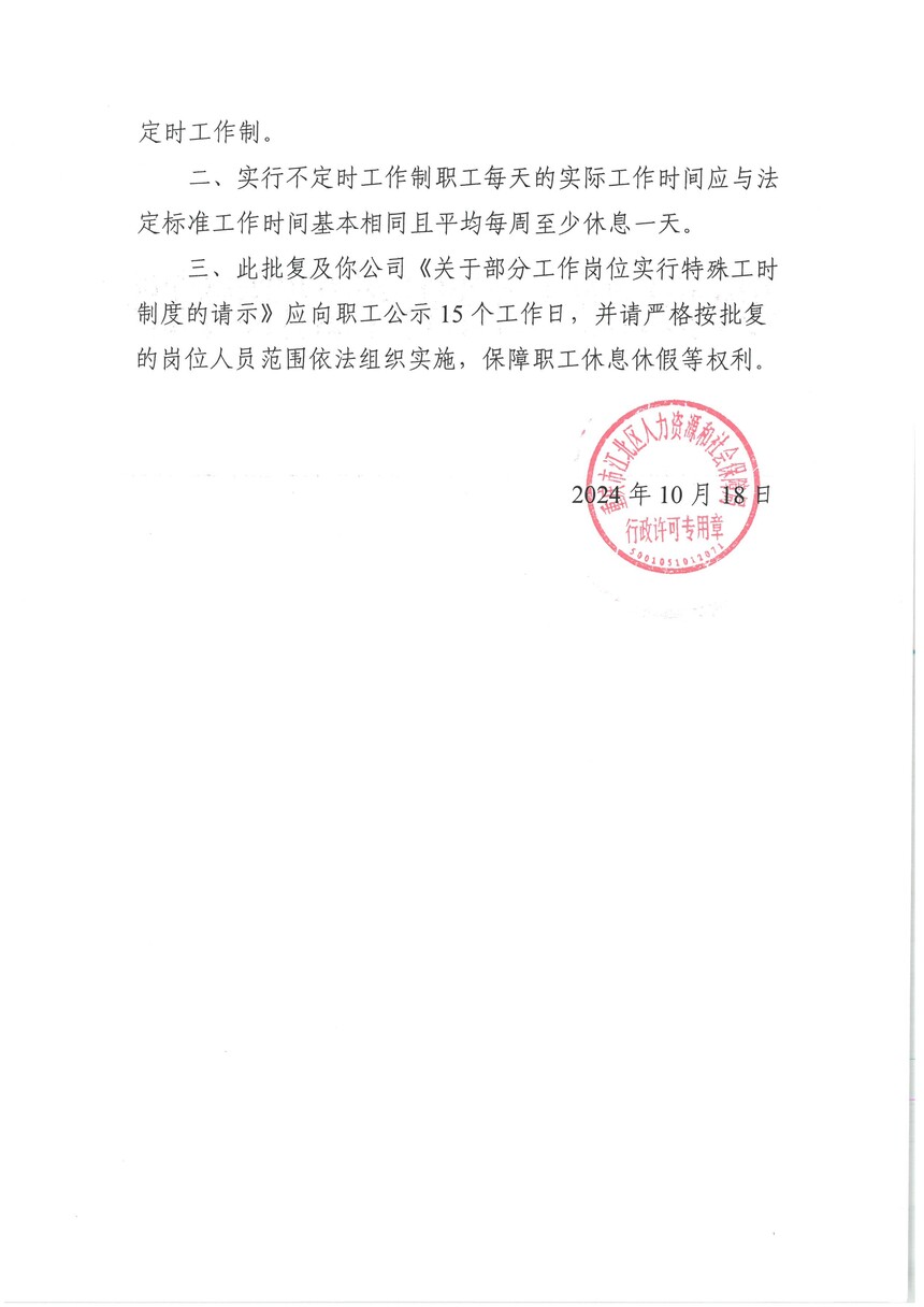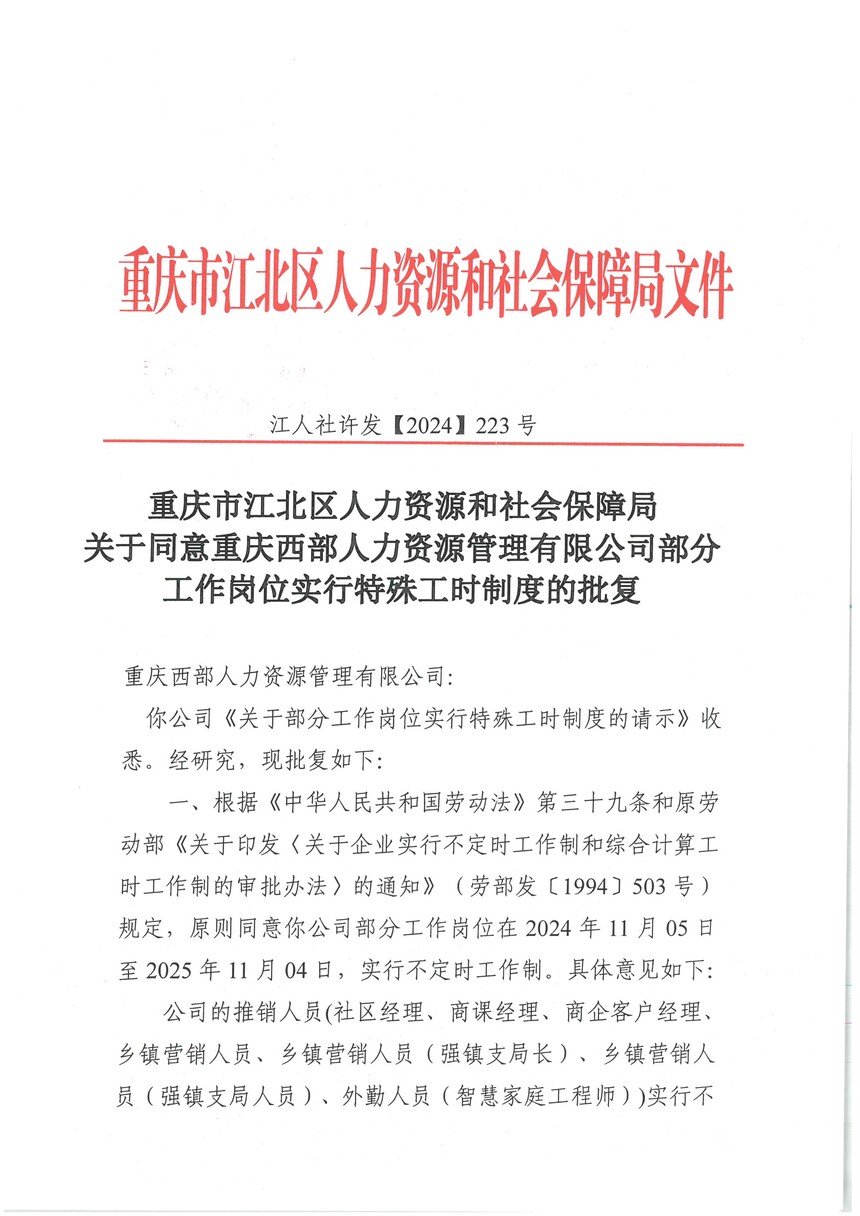 关于同意重庆西部人力资源管理有限公司部分工作岗位实行特殊工时制度的批复