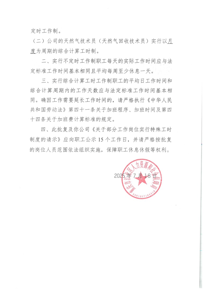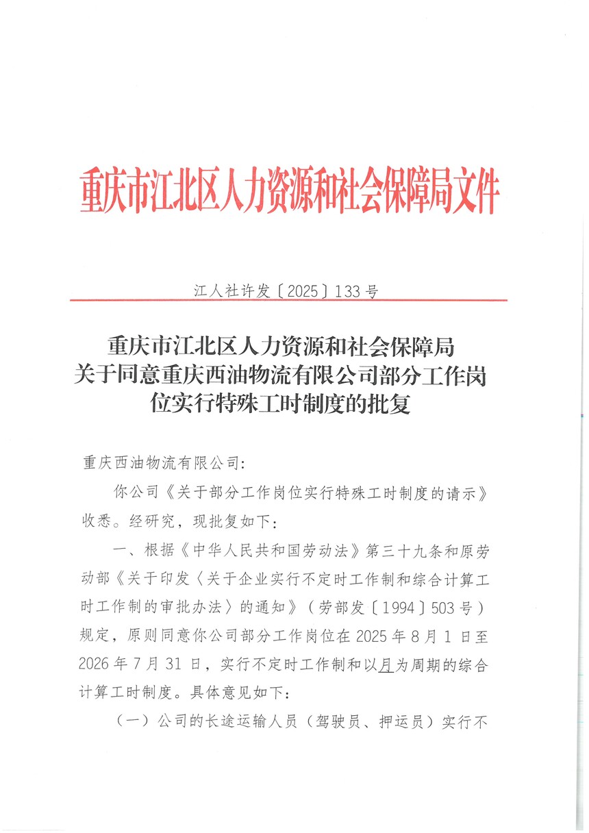 关于同意重庆西油物流有限公司部分工作岗位实行特殊工时制度的批复