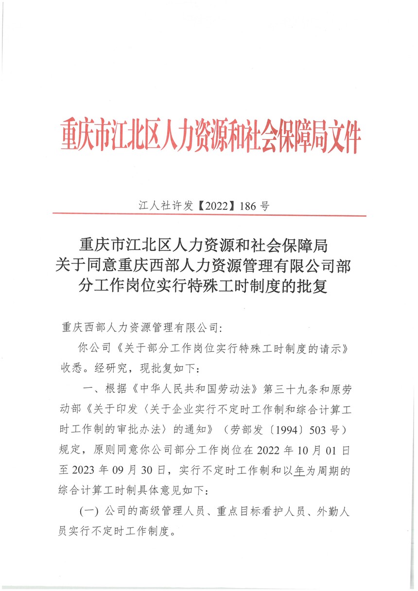 关于同意重庆西部人力资源管理有限公司部分工作岗位实行特殊工时制度的批复